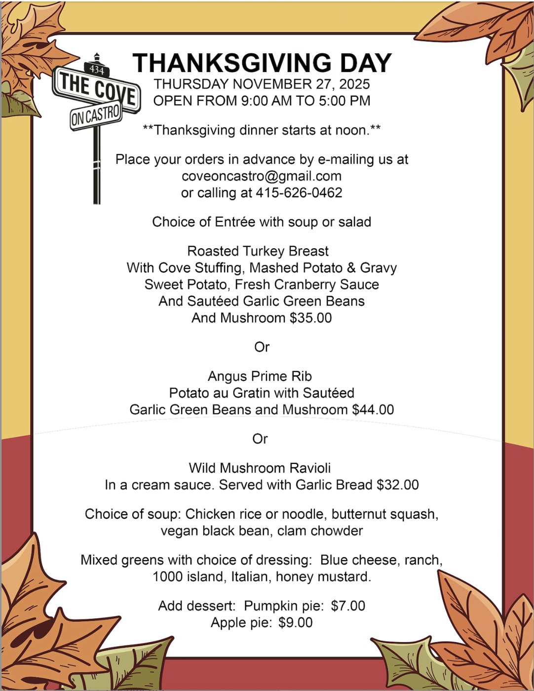 For more than 48 years, The Cove on Castro's delicious home-style meals have warmed hearts and stomachs for generations. With handmade soups and breads prepared fresh each day, the Cove is your welcome oasis on San Francisco's Castro Street for great food.